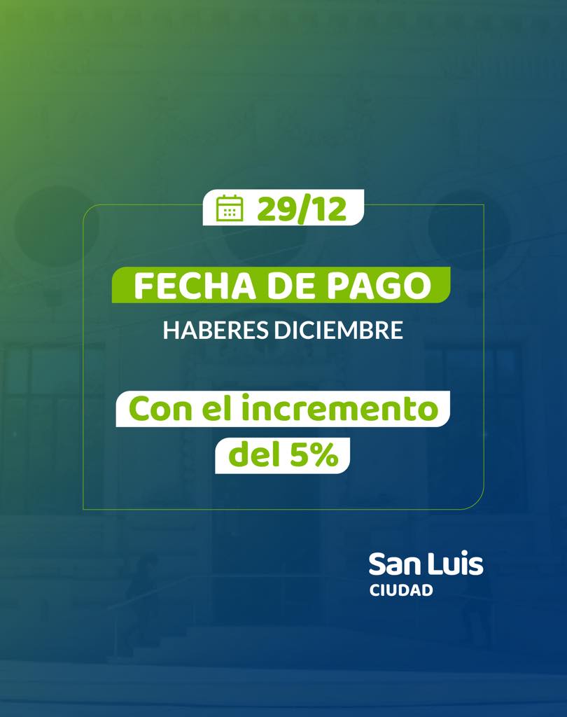 El próximo lunes 29 de diciembre se hará efectivo el pago de los haberes correspondientes al mes de diciembre para los trabajadores municipales.