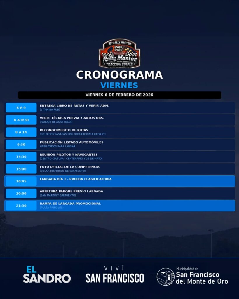 La actividad comenzará el viernes 6, con la reunión de pilotos, la foto oficial y la largada clasificatoria. Ese mismo día, a las 21:30, se realizará la Rampa de Largada Promocional en Plaza Pringles, un espectáculo abierto al público que marcará el inicio oficial del rally.